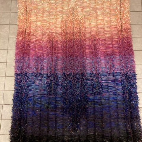 Pieni sievä seinäryijy. Taskuun voi laittaa vaikkapa kuivakukkia tai puolukanvarpuja koristeeksi.