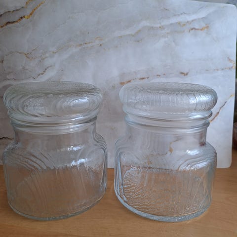 Myyn Oberglas Austria lasipurkin kannella. Merkki tarrat. Korkeus 14cm. Vaikka nimien säilytykseen.