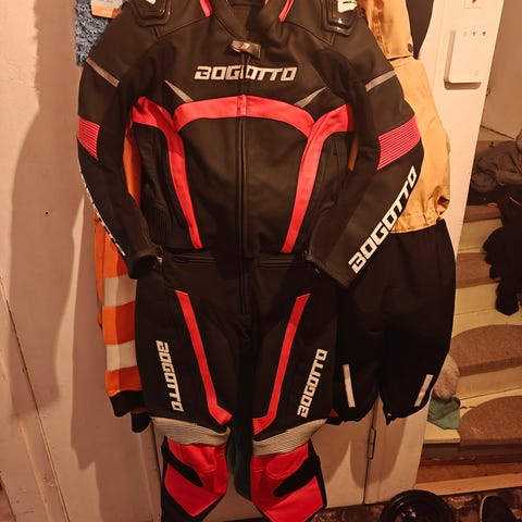 Nahkainen naisten moottoripyöräpuku. 2020 ostettu ja vähän käytetty. Takin ja housut voi liittää toisiinsa vetoketjulla tai käyttää erikseen. Koko 38.