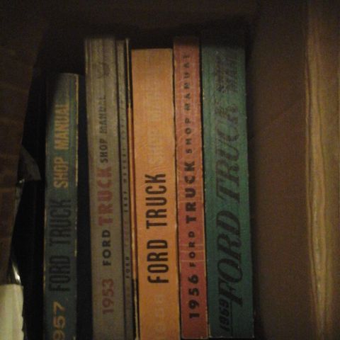 Kirjat ovat tehtaan alkuperäisiä korjaamokäsikirjoja (shop manual) ja sisältävät jenkkien Ford kuorma-autot kevyistä F100-F350 ja raskaisiin F500-F800.