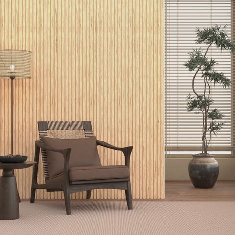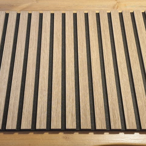 Noin 38cm leveä akustiikkapaneeli. Pituus taitaa olla hieman vajaa 250cm. (Kuvassa huonekorkeus 250) Ei ole ollut kiinni seinässä, odottanut projektia mutta suunnitelmiin tuli muutoksia. Leikattu toisesta reunasta, joten jos oikein tarkkaan katsoo niin sillä puolen pientä epätasaisuutta. Lämmin luonnollinen puinen sävy. Vaimentaa ääniä tehokkaasti sekä toimii sisustuselementtinä