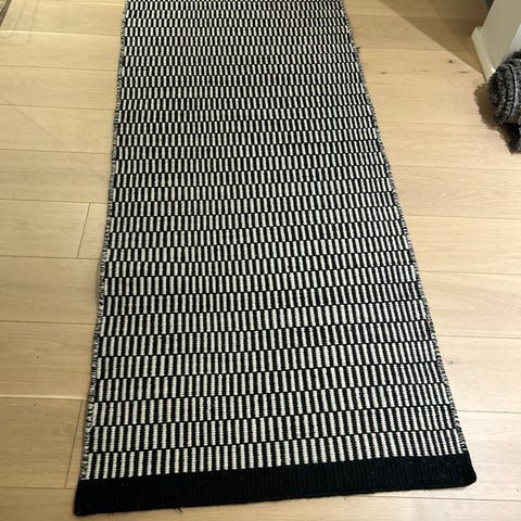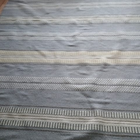 Myydään hyväkuntoinen mustavalkoinen villamatto (loimi mielestäni puuvillaa), koko mitattuna 210x302.