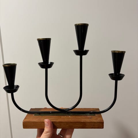 Vanha suomalainen tinakynttelikkö, kaiverruksessa "Jouluna 1937". Osa kynttilän paikoista hieman muuttanut muotoaan.