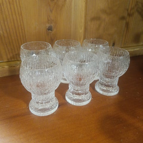 Iittala pienet juomalasit. Lasissa on kohokuvioitu, jääpintaa muistuttava koristepinta ja jalallinen muoto. Soveltuu esimerkiksi jälkiruokaviinien. sherryn ym nauttimiseen.