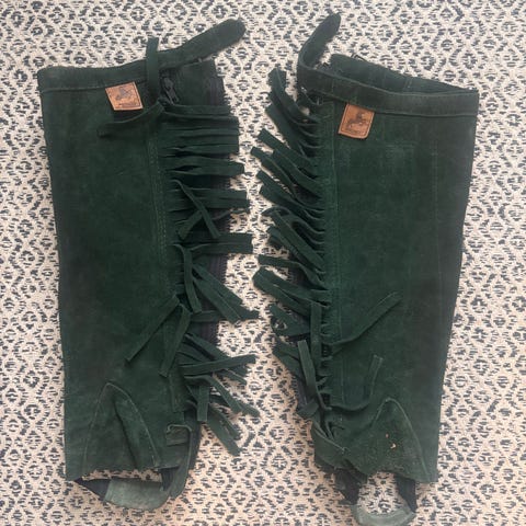 Mustat nahkaiset / mokkanahkaiset chapsit. Käytön jälkeä (etenkin vasemmassa) näkyy kuvista, ei kuitenkaan haittaa käyttöä. Vetoketju koko matkan alas. Koko S 3, mitat n: korkeus vetoketjun kohdalta: 40,5cm, nilkka 13cm, pohkeen levein kohta: 16cm.