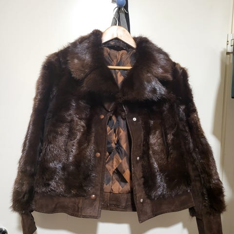 Pari kertaa pidetty 80-luvulla teetetty tummanruskea minkki nahkatakki. Koosta ei tietoa mutta mitat: