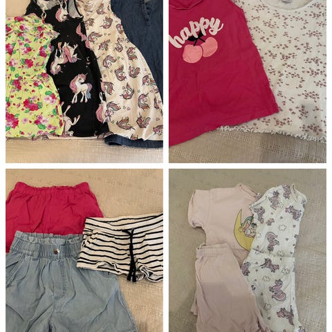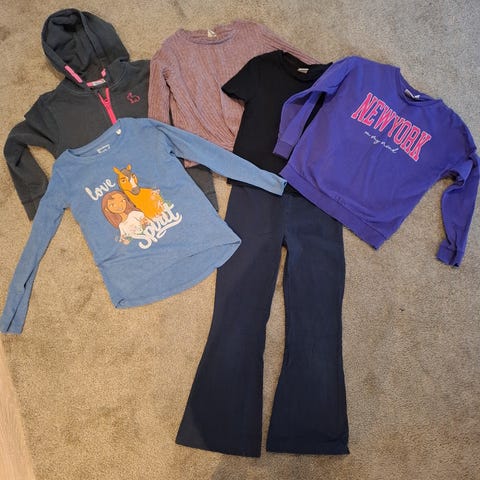 Kuvannäköiset käytössä olleet vaatteet koko 122-128, vaatteet pesty, ei silitetty, joten voi olla ryppyisiä. Nukkaa ja värikulumaa voi olla, muun ilmoitan jos huomaan. Nouto tai posti. En tee toridiiliä.