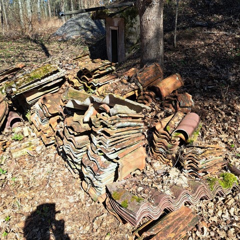 Hyväkuntoisia tiiliä noin 200 kpl ja 10 kpl harjatiiliä = yhteishintaan 100 €.
