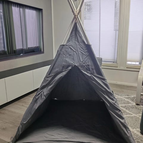 Myydään hyväkuntoinen, harmaa Minitude leikkiteltta/tiipii ja siihen kuuluva pohjakangas.
