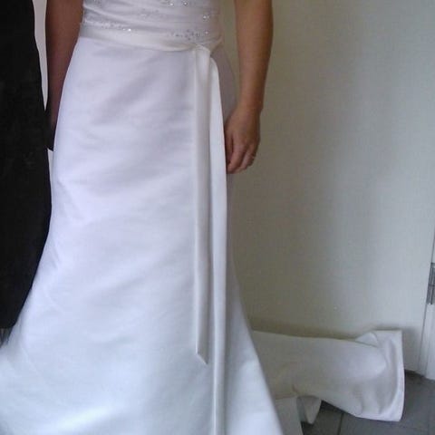 Myydään moitteettomassa kunnossa oleva vartalonmyötäinen, halter neck häämekko. Väri Ivory. Pesty.