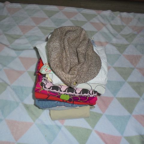 Myydään kuvan vaatepaketti. T-paitoja, pitkähihaisia, neuleita, mekko, farkkuja, unihousuja, sukkia (yhdet merinovillaiset).