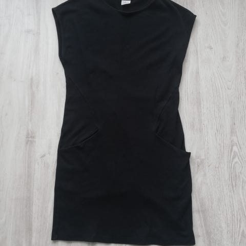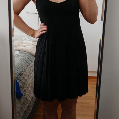 Harmaa mekko, koko 34, vastaa hyvin XS/S. Ei näy läpi enkä löytänyt kunnosta mitään moitteita. Edessä halkio molemmille puolille noin reiteen saakka. Pituus optimaalinen noin 155-163cm pitkälle (kuvassa 163cm pitkällä S-kokoisella, menee XS/S). Kangas on joustavaa.