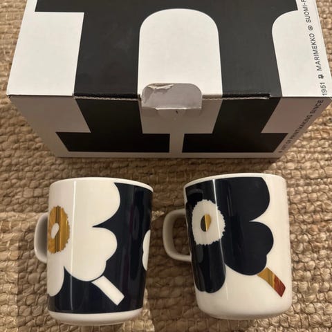 Myydään uusia Marimekko unikko juhlamuki pakkauksia.