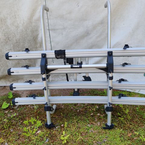 Myydään Thule Sport G2 polkupyöräteline matkailuautoon tai matkailuvaunuun. Kantavuus 2 (3). Yhden polkupyörän enimmäispaino 19 kg. Suurin sallittu paino 50 kg. Renkaan paksuus enintään 2.1"/53 mm. Pyörien välinen etäisyys 39 cm. Kokonaisleveys 126 cm. Korkeus 80-150 cm. Syvyys 65 cm. Paino 8.2 kg. Väri anodisoitu. Mallin numero 307126. Hinta: 150e.