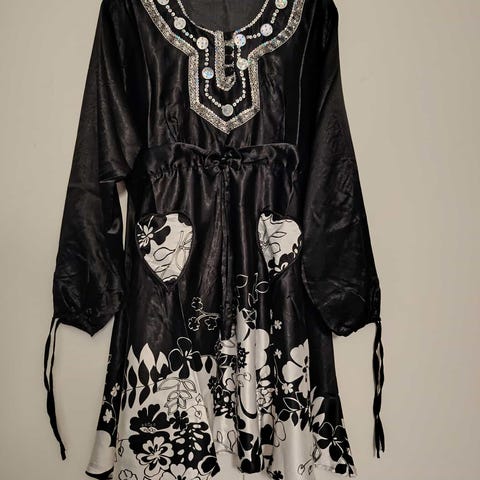 Pituus kaula-aukosta olkasauman kohdalta 93 cm.. Mekko on kevyt, miellyttävä päällä ja sopii erinomaisesti pikkujoulujouluihin.