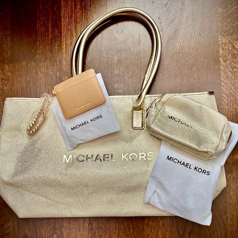 MICHAEL KORS KÄSILAUKKU NAHKA-UUSI, väri on kulta, leveys 27cm.,Korkeus 19cm., laukun sisällä on 2 lokeroa, 2 taskua, joista 1 on Vetoketjullinen, 8 taskua luottokorteille. ERINOMAISESSA KUNNOSSA