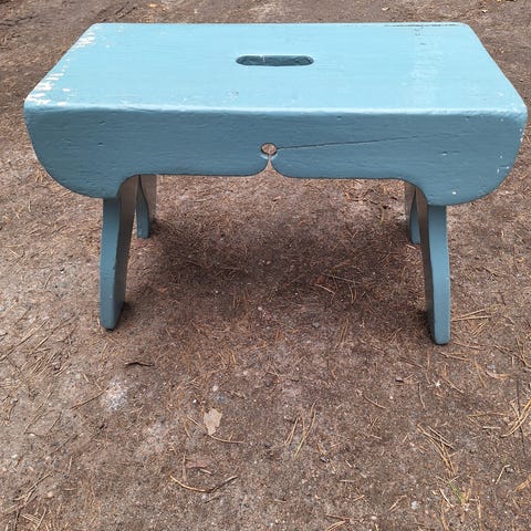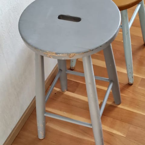 Kuvanmukainen kaksiväriseksi maalattu tukeva täyspuinen vanha jakkara. Jakkaran korkeus on 60cm. Istuimen halkaisija on 30cm ja paksuus 4cm.