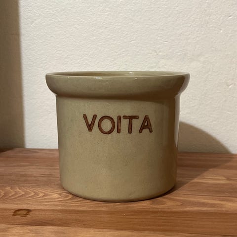 Myydään äitini 60-luvulla tekemä iso säilytysastia, iso kurkkupurkki päällystetty mustilla ja punaisilla muovinauhoilla. Korkeus n. 26 cm ja halkaisija n. 22 cm. Astian kannessa on kullanvärinen nuppi. Astia on hyvin säilynyt ja siisti. Terassinouto Paloheinästä (Helsinki) ja maksu 10 e käteisenä.