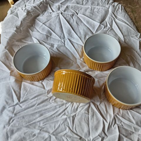 Myydään kuvan keltaiset ja siniset Yves Saint Laurent collection maison -merkkiset pikkukulhot, koko n. 12 x 11 cm. Hp. 125 e/kpl, 400 e/4 kpl.