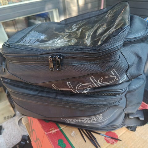 Erittäin vähän käytetty tankkilaukku. Käytännössä uuden veroinen. Jäänyt tarpeettomaksi, ei käy myöskään nykyiseen pyörään. Neliosainen, kaksi reppua, vyölaukku ja karttalaukku. Magneetti- ja remmikiinnityksellä.