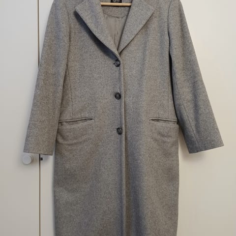 Espritin sinimustaruudullinen villakangastakki. Jonkin verran nukkaa pinnassa. Muuten ehjä ja siisti. Levenevä/mekkomainen malli.