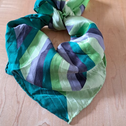 Myydään paisley-kuvioitu violetti silkkihuivi. Huivissa on muutamia hentoja kellastumia.