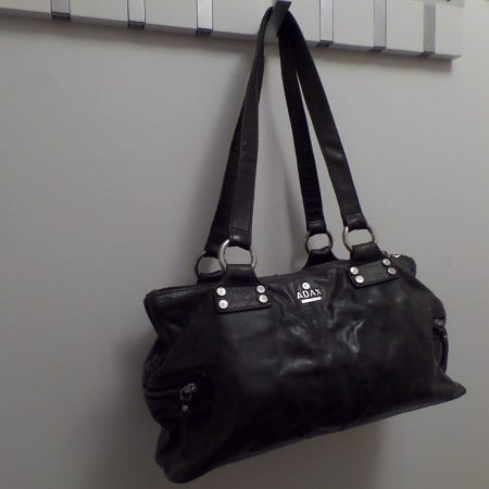 Musta Adax käsilaukku. Päätaskussa vetoketju, sisäpuolella yksi vetoketjutasku. Etupuolella vetoketjutasku. Mukaan tulee dustbagit.