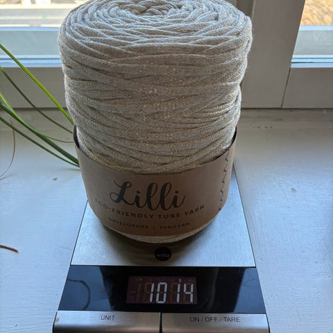 Toisesta rullasta leikattu 57 grammaa, lankaa jonkin verran rullattu auki ja rullattu takaisin keräksi. Toinen rullista avaamaton.