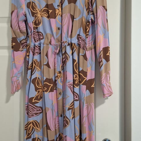 Vero modan ohutta kangasta oleva paitamekko koko S. Ihana ruusukuosi. Materiaali polyesteria. Edessä langanveto (kuva 3). Olka-helma 87 cm, kainalo-kainalo 49 cm.