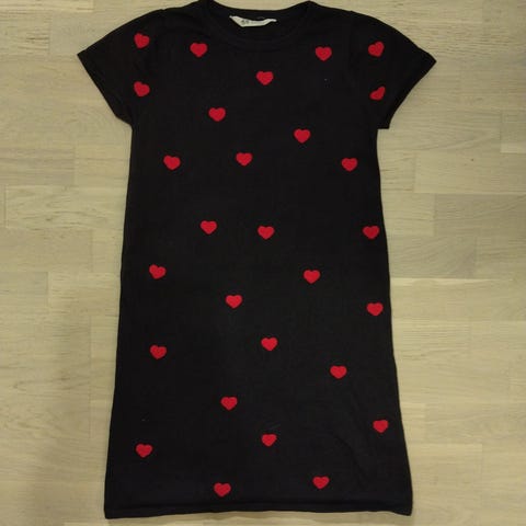 Lasten hyväkuntoinen, kellohelmainen mekko, H&M, kokomerkintä 146. Materiaali farkkukangasta, jossa valkoisia tähtiä. Takana metallinen vetoketju.