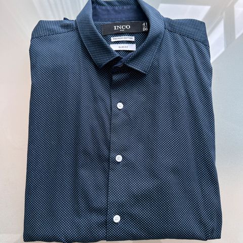 Valkoinen jossa vaalean siniset hihansuut ja kaulukset