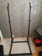 Itsetehty kuvanmukainen kyykkyteline. Leveys 72cm, syvyys 81cm, kokonaiskorkeus 150cm. Kiinteät paikat tangolle, mahdollistaa tangon paikan kyykkäämiseen sekä penkkipunnerrukseen.