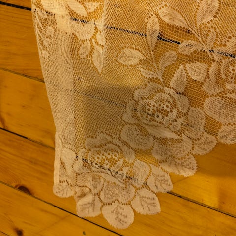 Myydään 2 kpl luonnonvalkoisesta kalastaja langasta virkattua pitsiverhoa.