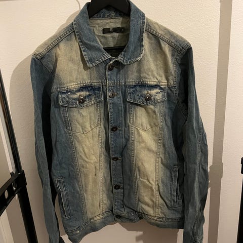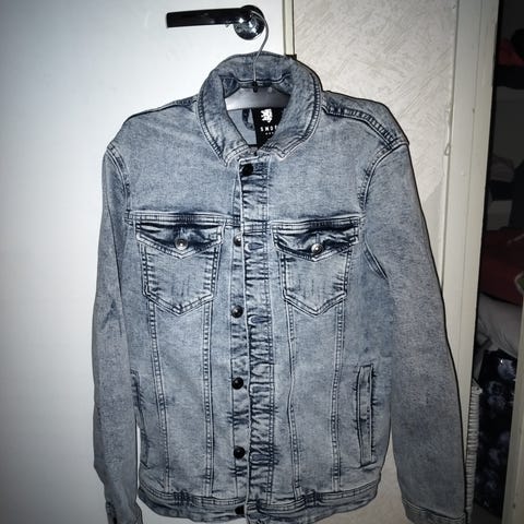 Hyväkuntoinen farkku-collegetakki. Koko M. Koiratalous.