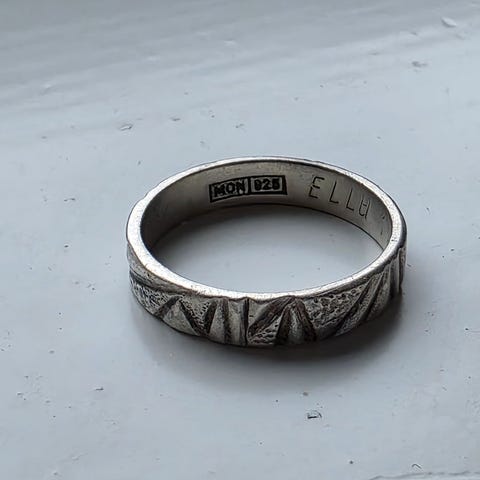 Hopeinen sormus, jossa kiinalaiset kirjoitusmerkit. Sisähalkaisija 18,5 mm. Materiaali hopeaa 925. Sisällä kaiverrus (nimi ja päivämäärä), vanha luokkasormus.