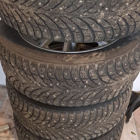 Myydään Mersun alkuperäiset vanteet nastarenkailla. Osanumero: A2104010402. Renkaat ei enää hyvät, nastoja puuttuu/painunut, pintaa n. 5mm. Vanteissa hapettumaa.