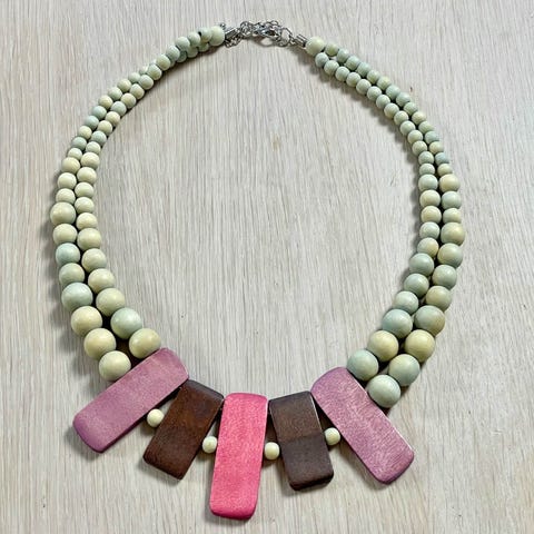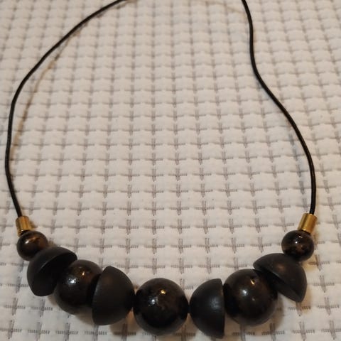 Kaunis ja persoonallinen käsintehdyn näköinen kaulakoru, jossa pienistä pyöreistä puuhelmistä koostuva ketju sekä koristeellinen Buddha-aiheinen riipus. Materiaali on puuta (puulaji ei tarkemmin tiedossa), ja korun sävy on lämmin, vaaleanruskea. Ketjussa on kierrettävä lukko. Korun kokonaispituus on noin 43,5 cm ja riipus noin 2,6 cm korkea.