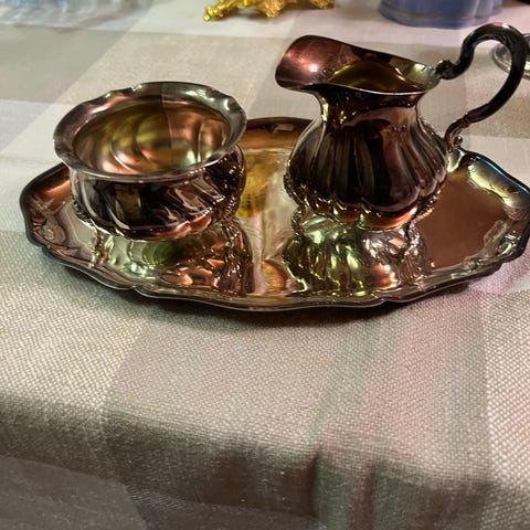 Hopeanvärinen sokerikko, kermakko ja aluslautanen