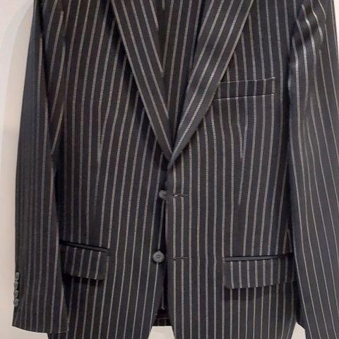 Pari kertaa käytetty räätälin tekemä laadukas musta liituraitapuku kokoa 48. Sopii n 175 cm normaalivartaloiselle/hoikalle henkilölle.