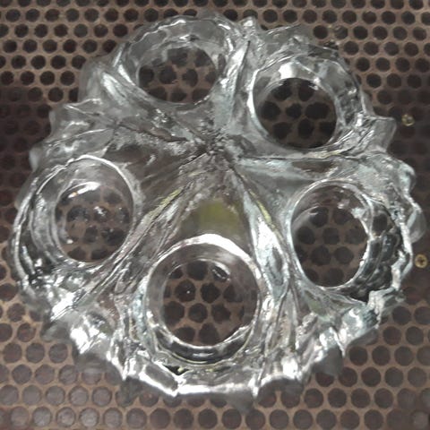 Joulumyyjäisistä joitain vuosia sitten (n 7?) nuorelta käsityöläiseltä ostettu koriste, johon soveltuu kaksi tuikkua. Tekniikasta en ymmärrä mutta tähän oli käytetty traktorista jotain osaa oliko se telaketju. Vahva kuin mikä. Tosi hieno mutta tilaa viepä.