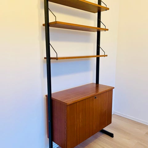 1970-luvun seinään kiinnitettävä, avohylly, 4 hyllyä.