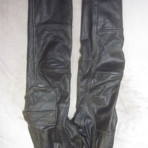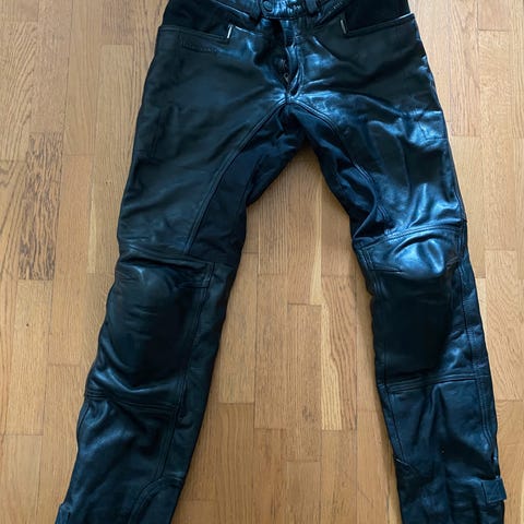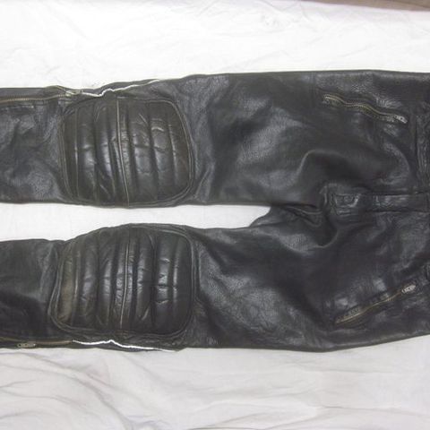 Hienot old school ajohousut oikeaa paksua nahkaa (made in Sweden). Hienot yksityiskohdat. Noin 106/80cm vyötärön/lahkeen mitat. Läppähaalarit korkealla vyötäröllä suojaa mukavasti ristiselkää kylmällä ajokelillä.