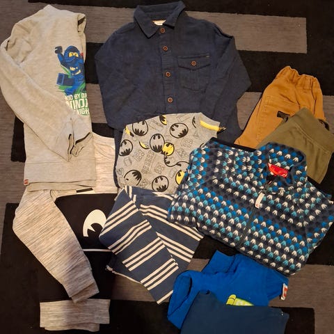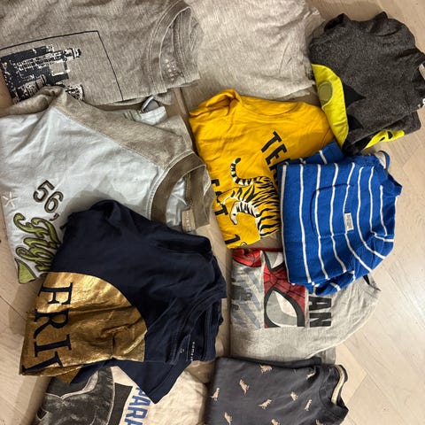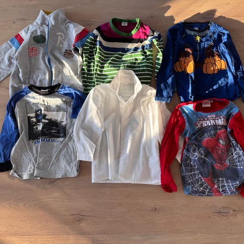 Hyväkuntoisia paitoja koossa 110cm-122cm. Huomiona, että yhdessä t-paidassa pikkuinen reikä ja saman paidan sauma lähtenyt purkautumaan. Näistä kuvat.