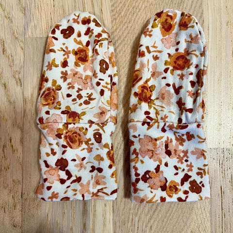 Myydään käsityönä tehdyt vauvan valkoiset tumput. Pituus 13cm ja leveys 7cm.