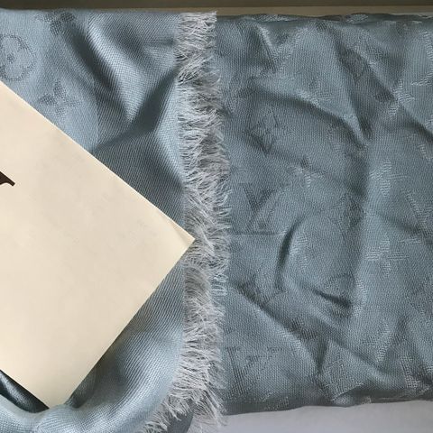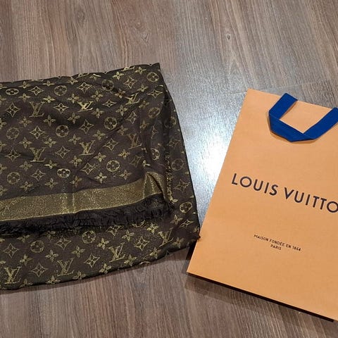 Mukaan huivin laatikko, paperi kassi, neljä erilaista ja kokoista LV kangas pussia, 2x sininen aurinkolasi kotelo ja yksi aurinkolasikotelon LV pahvilaatikko.