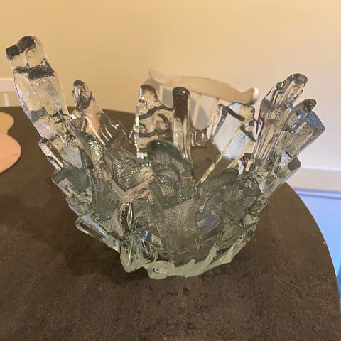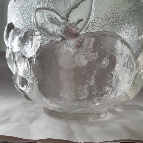 Humppilan Heiniä kainalossa -lasikulho, design Kaija Aarikka. Korkeus 18,5 cm, halkaisija 22 cm