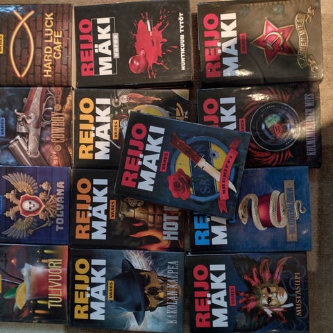 Kuvanmukaiset, hyvässä / ok iskussa olevat, pääosin kerran läpi luetut nidotut painokset Reijo Mäen kirjallisuuden ystäville.