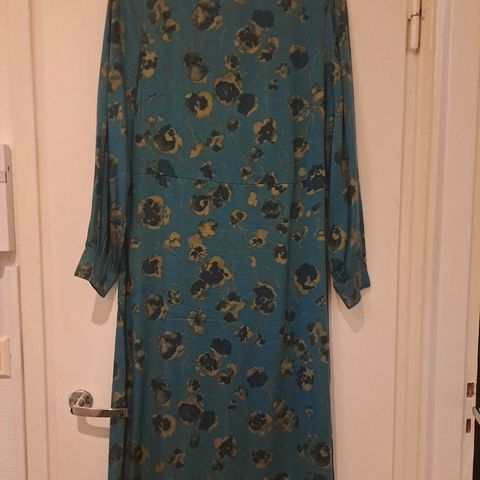 Kaunis, pitkä, n 146cm olha-helma mitta. vastaa hyvin kokoaan. takan vetoketju, päällinen aidonkityyppistä, ohutta läpikuultavaa, jonka alla koko matkalla vuori. jos postitus, postikulut 7,90 lisätään