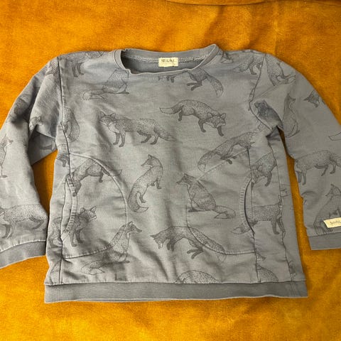 Myydään lasten trikoopaita kettuprintillä. Vihertävä väri, kuvissa väri toistuu vähän huonosti.