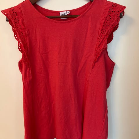★ Kimaltava punanen paita, kerran käytetty koko L. Hihoissa koristenapit ja helma hieman kolmion mallinen. (2€)